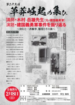 講演会・勉強会・会議 【2/8】第廿三回「草莽崛起の集ひ」の御案内 by 編集部 • 2026年1月14日 ●講師 :木村岳雄先生(元・建国義勇軍) ●日時:令和八年二月八日(日曜日)十七… Read more →