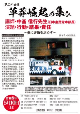講演会・勉強会・会議 【5/10】第二十四回「草莽崛起の集ひ」 by 編集部 • 2026年4月6日 講師・中釜信行先生(日本皇民党本部長) 演題・行動・結果・責任 〜他に評価を求め… Read more →
