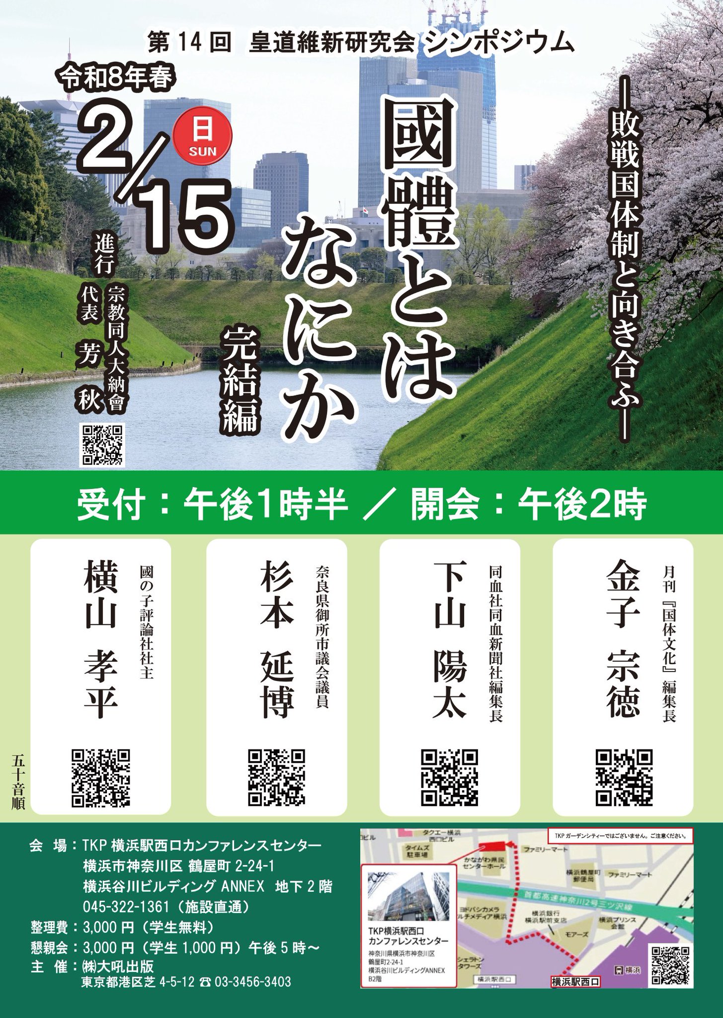 講演会・勉強会・会議 【2/15】「國體とはなにか」 完結編 by 編集部 • 2025年12月22日 • 【2/15】「國體とはなにか」 完結編 はコメントを受け付けていません 第十四回皇道維新研究会シンポジウム「國體とはなにか」 完結編 令和8年2月15日(日) TKP横浜西口カンファレンスセンター 午後1時半開場 午後2時開会 開場整理費 3,000円 関連記事 【4/27】第十二囘 皇道維新研究会ー大吼座談「それぞれの立場から描く日本」ーのお知らせ 会場:かながわ労働プラザ 横浜市中区寿町 1-4 TEL.045-633-541…Read more →... 【10/18】第13回 皇道維新研究会開催さる 十八日午後七時より横浜に於いて「第13回 皇道維新研究会開催」が開催された。 テ…Read more →... 和歌と大和心 二十日、港区青山に建つ大東会館にて第八十七回歌道講座が行はれた。 講師は福永眞由…Read more →... 遊学記その一「熊本有志の集ひ」 十二日、熊本県熊本市で「熊本有志の集ひ」が行はれた。講師は同血社・河原博史会長。…Read more →... 皇国復古中興講演会開催さる【鹿児島市】 皇国復古中興講演会が松田晃平氏主催で二十六日開催された。 鹿児島県に本拠を置く國…Read more →...
